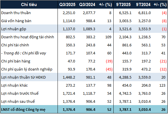 Không chỉ doanh thu thuần, doanh thu tài chính trong quý 3 cũng tăng đáng kể, gấp đôi cùng kỳ, với gần 803 tỷ đồng, toàn bộ là lãi tiền gửi, cho vay và đặt cọc.