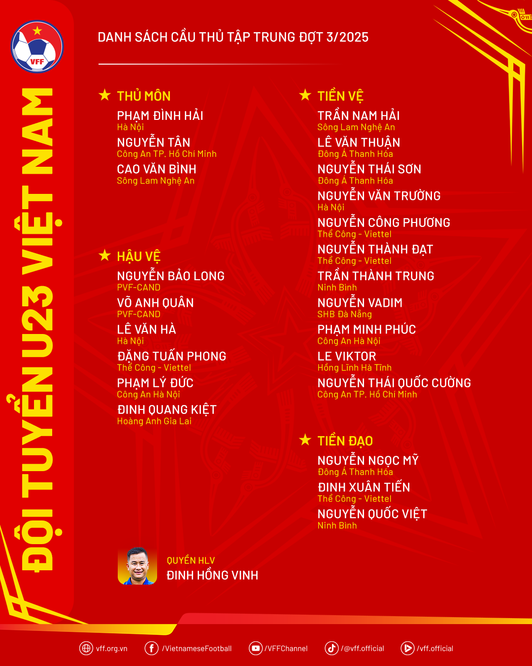 Ở đợt tập trung lần thứ ba trong năm 2025, ngoài những gương mặt quen thuộc như Phạm Lý Đức, Lê Văn Thuận, Nguyễn Văn Trường hay Nguyễn Ngọc Mỹ, đội còn chào đón sự xuất hiện của tân binh Việt kiều Nguyễn Vadim (SHB Đà Nẵng). Sinh năm 2005 tại Nga, Vadim có bố là người Việt, mẹ là người Nga, cao 1m75 và thi đấu linh hoạt ở cả vị trí tiền vệ cánh lẫn trung tâm.