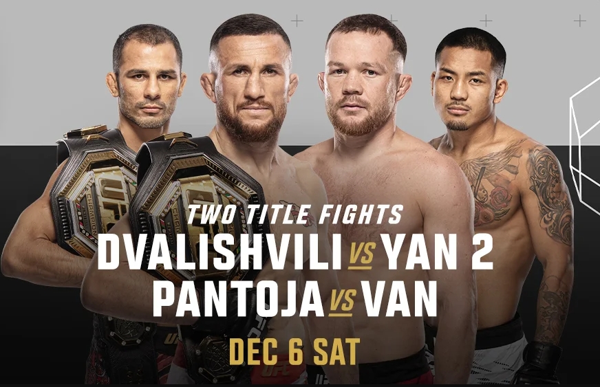 Merab Dvalishvili sẽ bảo vệ đai Bantamweight trước Petr Yan trong trận tái đấu rất được chờ đợi. Ở lần chạm trán đầu tiên năm 2023, Dvalishvili thắng điểm sau 5 hiệp, mở ra chuỗi trận giúp anh leo lên đỉnh. Năm 2024–2025 chứng kiến võ sĩ người Georgia thiết lập tốc độ bảo vệ đai đáng kinh ngạc: thắng Henry Cejudo, Sean O’Malley, Umar Nurmagomedov và Cory Sandhagen trong cùng một năm thi đấu.