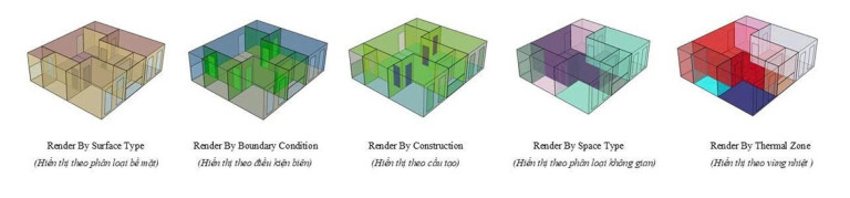 Nhóm tác giả đã mô phỏng thiết kế cải tạo một căn hộ chung cư trên thực tế có mặt thoáng hướng Tây Bắc. Không gian nội thất cần cải tạo được chia thành các vùng dựa trên phân loại bề mặt, điều kiện biên, cấu tạo, chức năng sử dụng, vùng nhiệt và tầng công trình nhằm phục vụ cho quá trình tính toán sau đó. Các yếu tố như vật liệu tường, trần, sàn, kính, diện tích, hướng cửa sổ, hay các thiết bị điện được gán dữ liệu chi tiết vào phần mềm nhằm phản ánh chính xác khả năng thông gió, truyền sáng, truyền âm, cách nhiệt… của từng bộ phận. Bên cạnh đó, mô hình cũng được thiết lập với các thông số khí hậu địa phương, lịch vận hành, cùng các dữ liệu liên quan khác nhằm đảm bảo kết quả mô phỏng có độ chính xác cao và phù hợp với điều kiện thực tế.