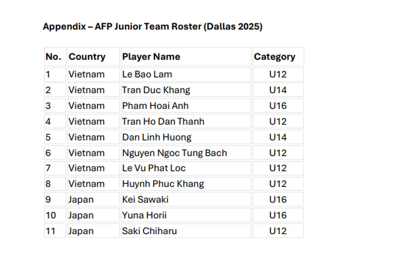 Liên đoàn Pickleball châu Á (AFP) vừa công bố danh sách 11 vận động viên trẻ xuất sắc đại diện châu lục tham dự Giải Vô địch Pickleball Thế giới Jenius Bank 2025. Đáng chú ý, Việt Nam đóng góp tới 8 gương mặt, áp đảo về số lượng và thể hiện sự phát triển mạnh mẽ của phong trào pickleball trong nước.
