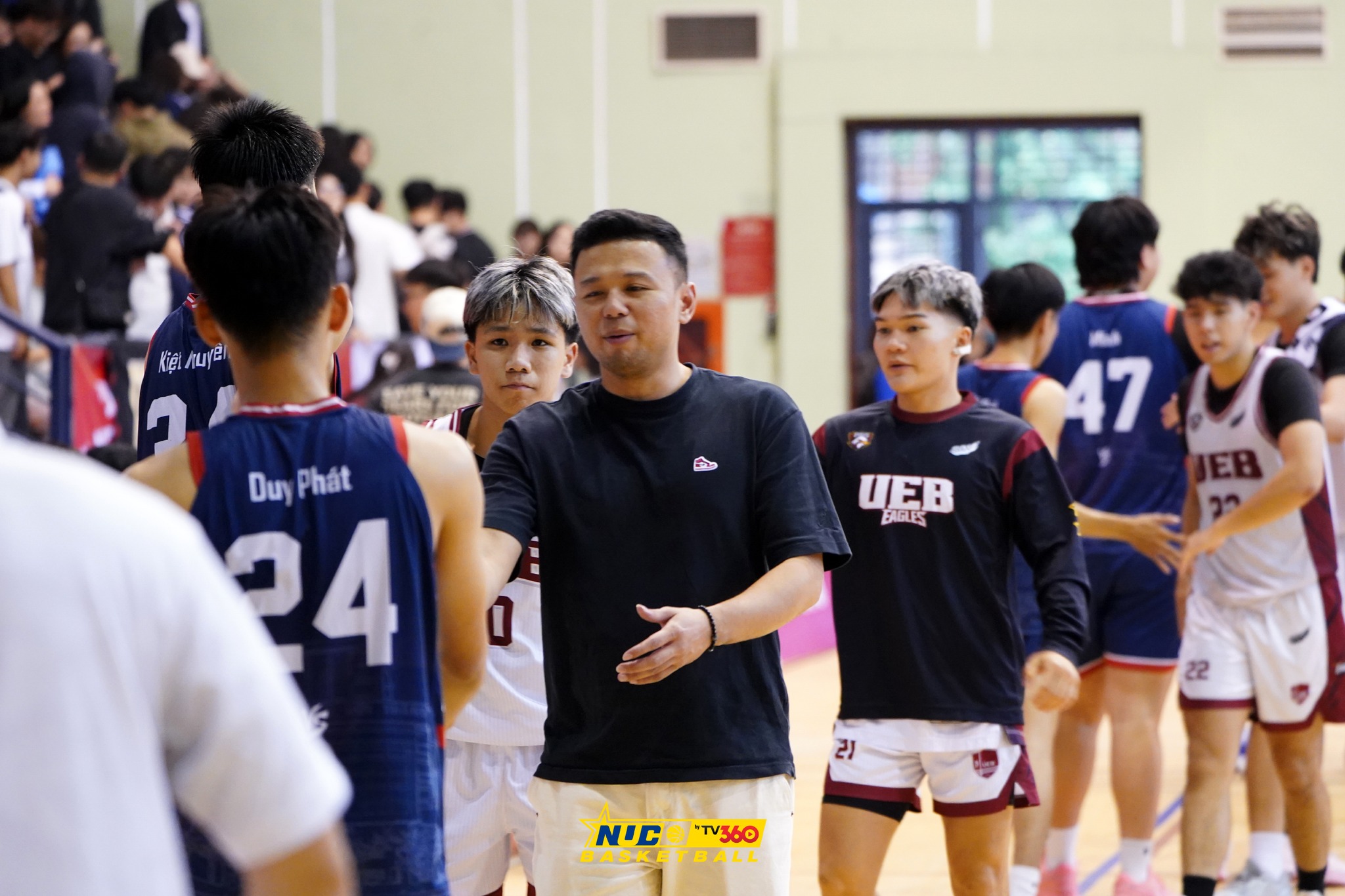HLV Trương Hoàng Trung của Trường Đại học Kinh Tế - ĐHQG Hà Nội bắt tay Duy Phát sau trận đấu