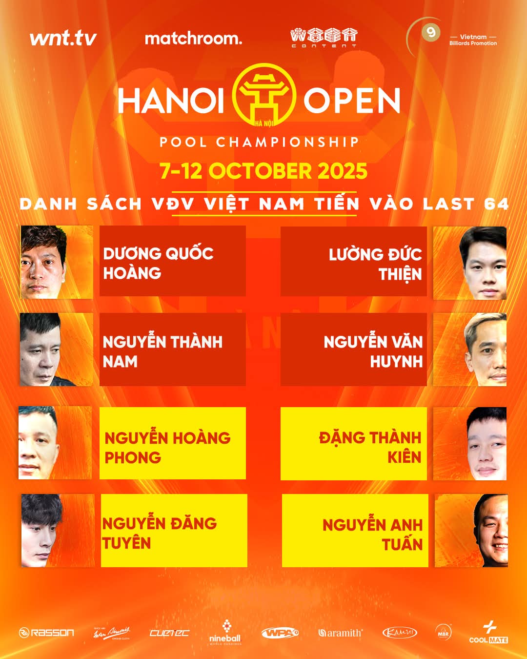 Danh sách 14 cơ thủ Việt Nam xuất sắc tiến vào vòng đấu Last 64 của Hanoi Open Pool Championship 2025: