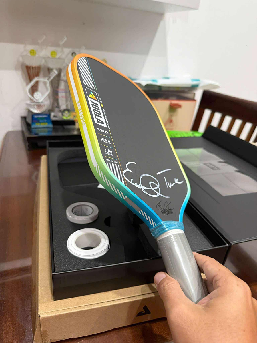 Vật phẩm được đấu giá là chiếc vợt Joola Gen 4 Summer Daze phiên bản giới hạn - một trong những mẫu vợt được săn đón nhất trên thị trường quốc tế hiện nay. Đặc biệt, giá trị của chiếc vợt được nâng lên đáng kể nhờ những chữ ký tươi của các ngôi sao hàng đầu làng pickleball thế giới: Ben Johns, Dekel Bars, Oncins, Tyson McGuffin và Phúc Huỳnh.
