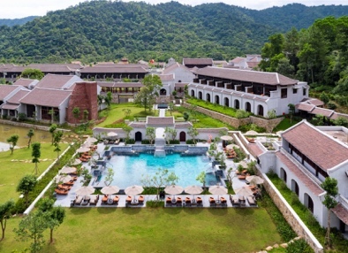 Emeralda resort, (Ninh Bình) thiết kế theo phong cách làng quê Bắc Bộ truyền thống với nhà ngói đỏ, cổng gỗ và tường gạch cổ